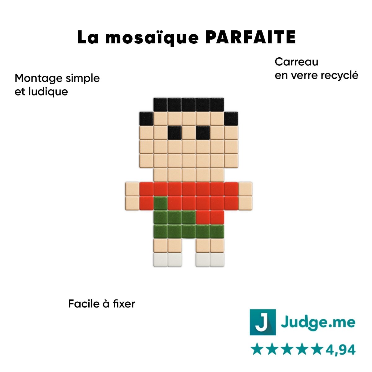 Tout le matériel nécessaire est présent dans nos kits : carreaux de mosaïque, tube de colle, grille en fibre de verre, modèle à suivre et même une petite surprise...