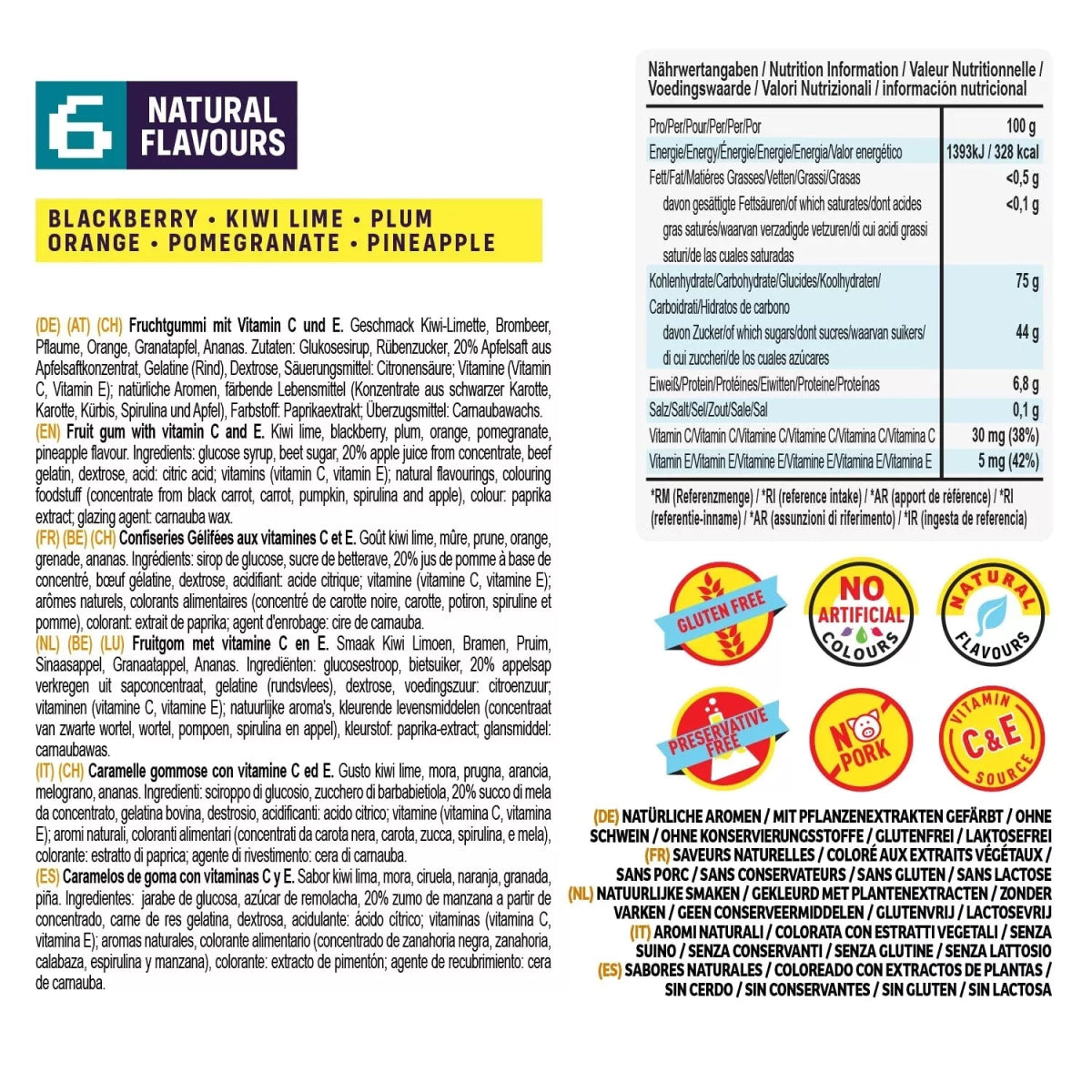VITAMINES : Avec une teneur en jus de fruits de 10% et des vitamines C et E, ces bonbons fruités, en plus d'être délicieux, sont d'une très bonne composition.