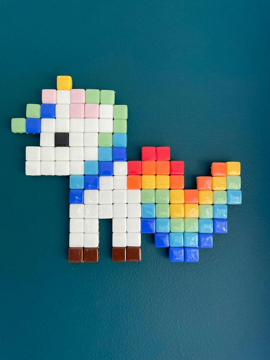 👉 Quick, clean and fun installation: stick your tiles one by one and let your colorful unicorn appear.