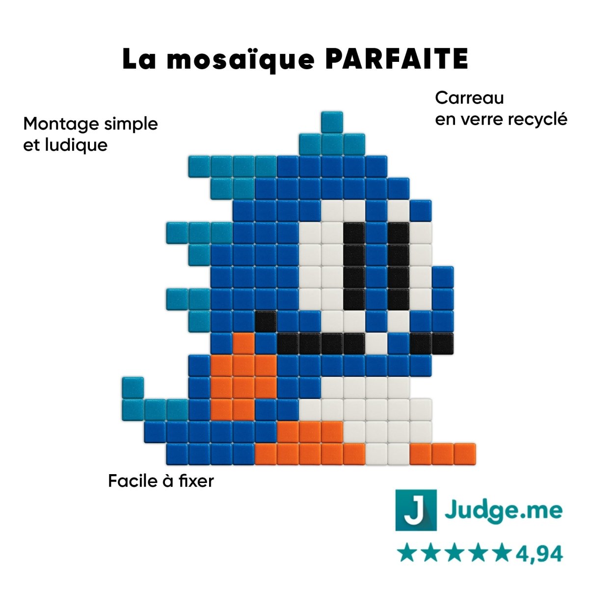 Tout le matériel nécessaire est présent dans nos kits : carreaux de mosaïque, tube de colle, grille en fibre de verre, modèle à suivre et même une petite surprise...