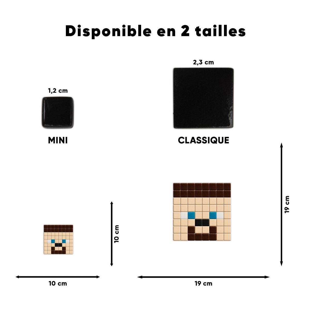 Nos kits sont disponibles en deux tailles de carreaux : mini (1,2 cm) ou classique (2,3 cm). Et en option : nos carreaux phosphorescents.