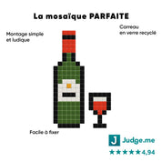 Chaque carreau en verre recyclé se fixe facilement, sans outils complexes ni salissures. Pas à pas, votre mosaïque prend forme et devient une pièce originale à exposer partout : dans un salon, une cuisine, une entrée, une terrasse extérieure… ou encore dans un bar, un restaurant ou une cave à vin pour les passionnés comme les professionnels.