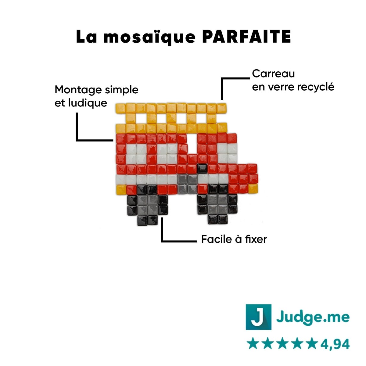 Tout le matériel nécessaire est présent dans nos kits : carreaux de mosaïque, tube de colle, grille en fibre de verre, modèle à suivre et même une petite surprise...
