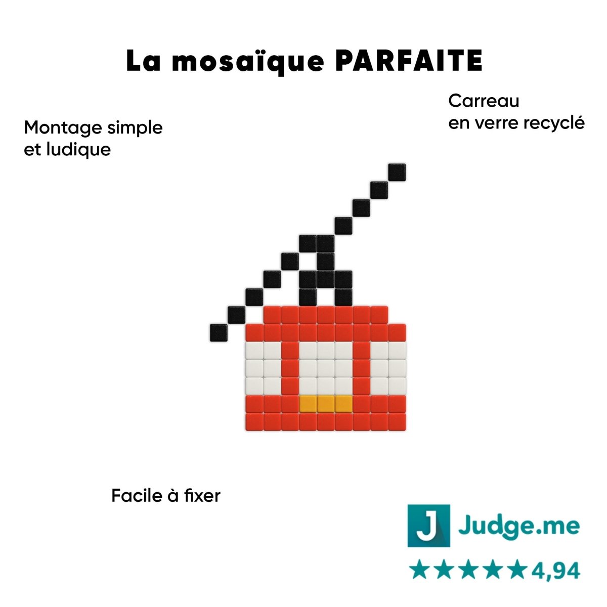 Tout le matériel nécessaire est présent dans nos kits : carreaux de mosaïque, tube de colle, grille en fibre de verre, modèle à suivre et même une petite surprise...