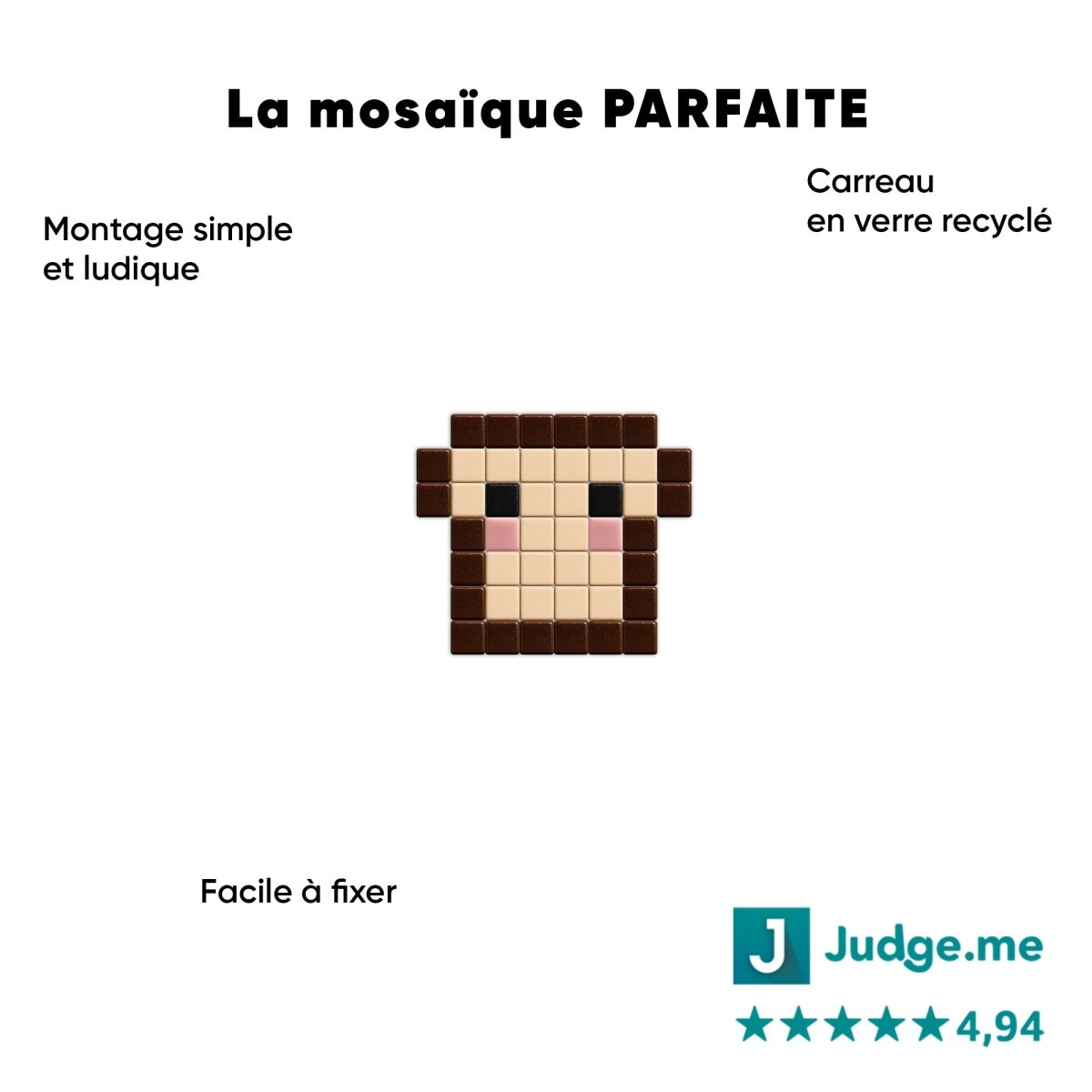 Tout le matériel nécessaire est présent dans nos kits : carreaux de mosaïque, tube de colle, grille en fibre de verre, modèle à suivre et même une petite surprise...